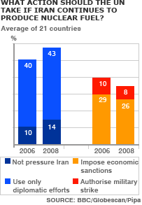 شرکتکنندهگان از کشورهای اسرائیل، آمریکا و کره جنوبی خواستار برخوردهای خشن و سخت (مثلا برخورد نظامی) با ایران شدهاند، در حالیکه نظردهندهگان از مصر، اندونزی و روسیه خواستار برخوردهای ملایم (اعمال تحریم) با ایران هستند. مقایسه آمار سال 2006 و 2008 هم نشان میدهد که اصولا خواست عمومی برای تحریم یا برخورد نظامی در همه کشورها کاهش یافته است، ولی این همه ماجرا نیست. بر اساس نتیجه این نظرسنجی افکار عمومی مردم آمریکا و اسرائیل به شدت موافق برخورد شدید یا نظامی با ایران است.