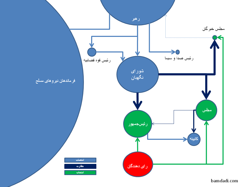 سلام آقای بامدادی… اگر درست گفته باشم! این پاراگرافتون جامع بود و چند نکته داشت یکی این که نوشتید: «…واقعیتها و مقیاس توزیع قدرت واقعی در ساختار یک سیستم سیاسی را در نظر بگیرید.» که نشان دهنده یک تحلیل جامع(حداقل با یک نگاه گذرا) است» و بنده هم همین نظر رو دارم که در هر سیستمی باید حقایق را دید یعنی این در ایران صدق می کند در هر جای دیگری هم همینطور است؛ و باید دید در آن نظام، یک نهاد یا سازمان چه وظایفی بر عهده دارد، طبق قانون و تا چه حد می تواند یا می خواهد! از آن ها استفاده کند و بعلاوه آنکه در هر شرایطی هر نظام ای انعطاف میابد به مصالحی که خود می ببیند که ممکن است درست باشد یا اشتباه. اینها را حتما خود می دانید؛ آنجا که گفتید: » … نهادها همیشه نمیتوانند از اختیارات قانونی خودشان استفاده کنند و یا برعکس». این نکته هم واضح و منصفانه است: «ممکن است عملا نفوذ و اختیاراتی به مراتب بیشتر از چیزی که در قانون برایشان در نظر گرفته شده داشته باشند.» اما اینجا کمی گنگ و کلی است: «در دیاگرام واقعی، صرفنظر از نهادهای رسمی، نهادهای غیررسمی یا در سایه نیز حضور دارند و روابط واقعی لزوما در سه حالت انتصاب/نظارت/انتخاب نمیگنجند و ترکیبهای پیچیدهتری دارند.» بهتر بود مثالی برای این بخش می زدید.