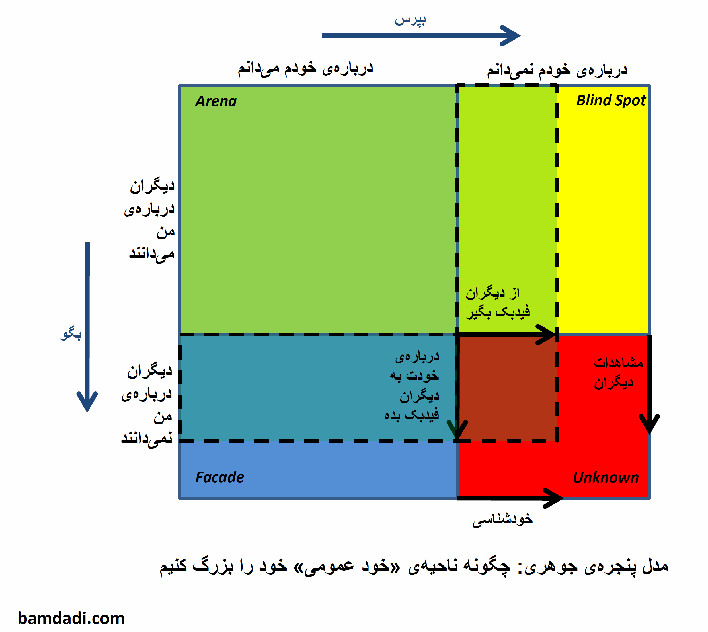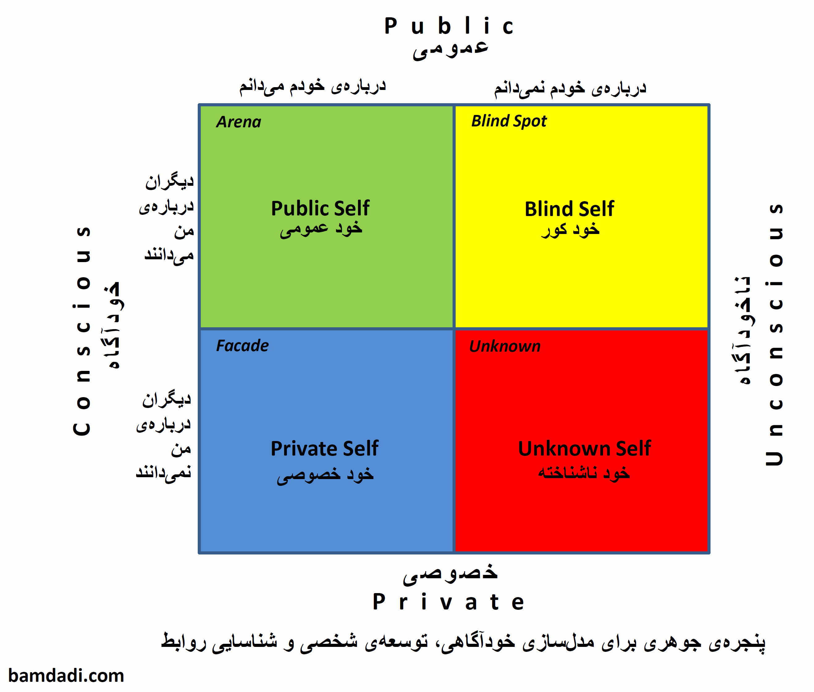ناحیه‌های چهارگانه‌ی فوق پنجره‌ی جوهری (Johari Window) را شکل می‌دهند (برای مشاهده‌ی فایل با کیفیت بالا روی آن‌ کلیک کنید):