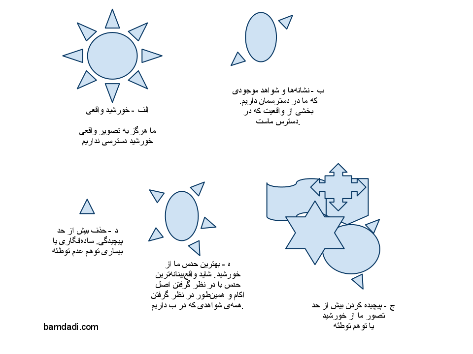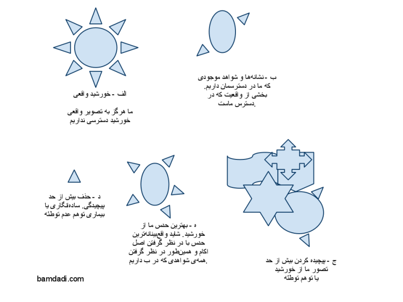 اما قسمت پایانی گفته‌تان را در مورد مثال‌ها متوجه نمی‌شوم. در این مثال من تاکید کرده‌ام که واقعیت خورشید را ما هرگز نمی‌دانیم اما فرض کنید که (برای پیش‌برد مثال) بدانیم که خورشید این‌گونه است که در الف آمده. در این صورت می‌بینیم که واقع‌بینانه‌ترین طرح متعلق به ه است. از طرف دیگر اگر مدل واقعی خورشید را هم در نظر نگیریم، با در نظر گرفتن اصل اکام و فرضا اصل تقارن تقریبی شکل خورشید دانشمند واقع‌بین می‌تواند به مدل ه برسد.