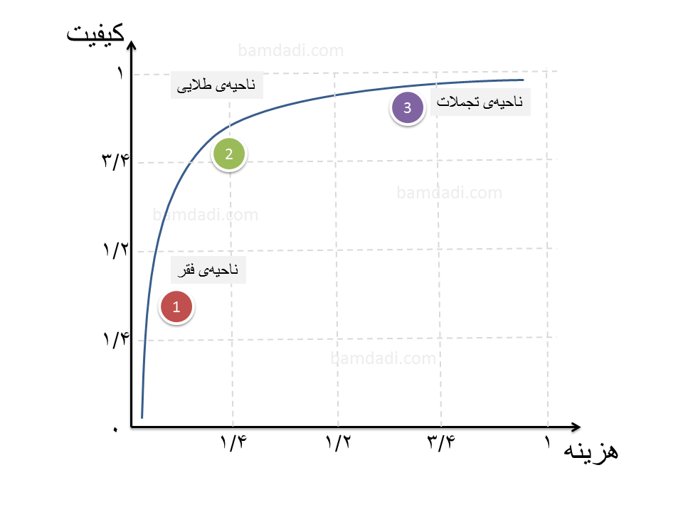 اجازه دهید منحنی بالا را به سه ناحیه‌ی تقریبی تقسیم کنیم. اول ناحیه‌ی فقر است. در این ناحیه شما هزینه‌ی خیلی کمی می‌کنید و کیفیت خیلی پایینی نیز دریافت می‌کنید. دوم ناحیه‌ی طلایی است. در این ناحیه شما هزینه‌ی نسبتا کمی می‌پردازید که فقط اندکی از هزینه‌ای که در ناحیه‌ی فقر می‌پرداختید بیشتر است، اما به ازای آن کیفیت خوبی دریافت می‌کنید. سوم را ناحیه‌ی تجملات می‌نامیم چرا که این‌جا شما هزینه‌ی بسیار زیادی می‌کنید تا کیفتی که فقط اندکی بهتر از ناحیه‌ی طلایی است را دریافت کنید.