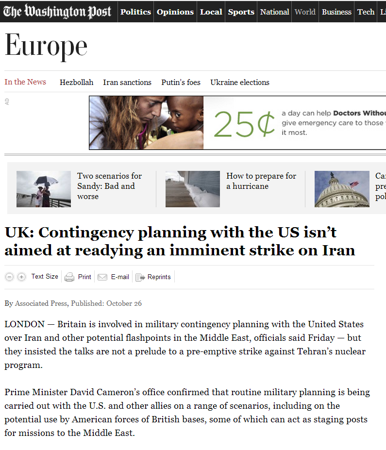 یک روز بعد [از انتشار مقالهی پولیتیکو]، دیوید ایگناتیوس (David Ignatius) ستوننویس واشنگتنپست که به خاطر تحلیلهایش از طرز فکر مقامات عالیرتبهی آمریکا در حوزهی امنیت ملی (او از قدیم با مقامات ارشد سیاسی تماس نزدیک دارد)، خبر از استراتژی مشابهی داد. او که دیدگاه یک مقام ناشناس دولت اوباما (که مورد استناد پولوتیکو قرار گرفته بود) را منعکس میکرد نوشت که به نظر میرسد فشار اقتصادی بر ایران «به سود غرب عمل میکند»، حتی در شرایطی که مذاکره کنندههای ایرانی هنوز آزادی عمل کافی برای پذیرش شرایط آمریکا را ندارند.